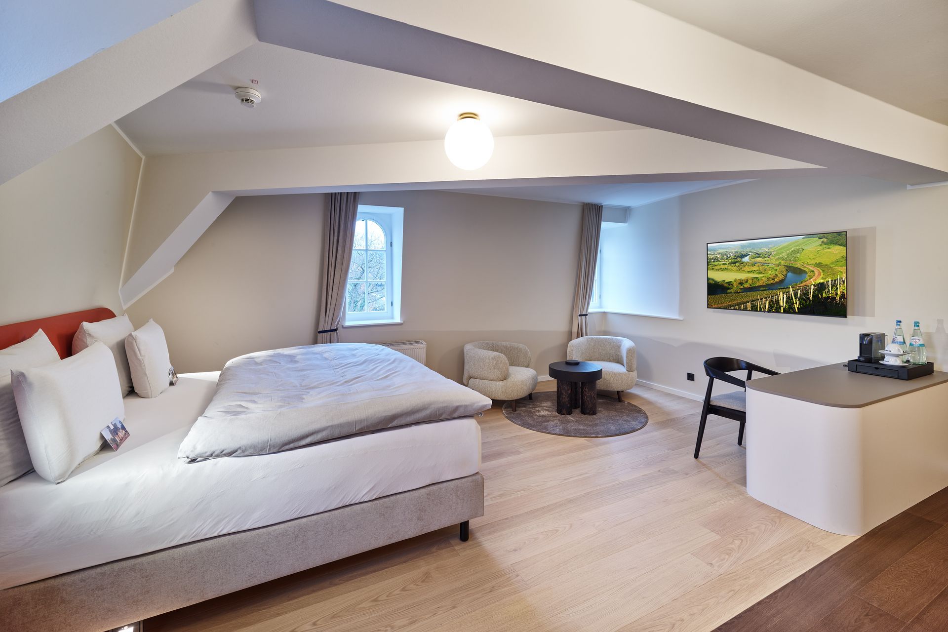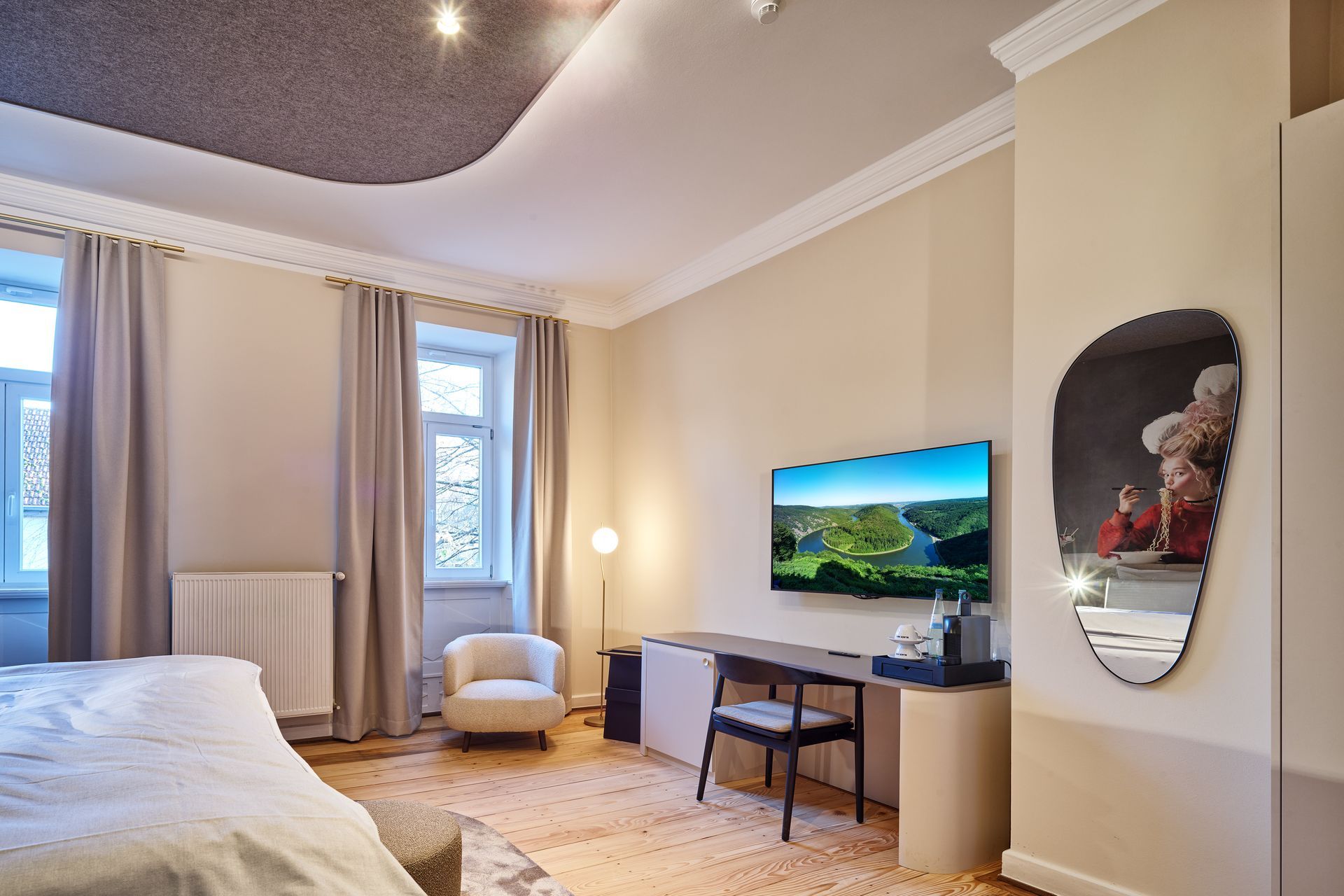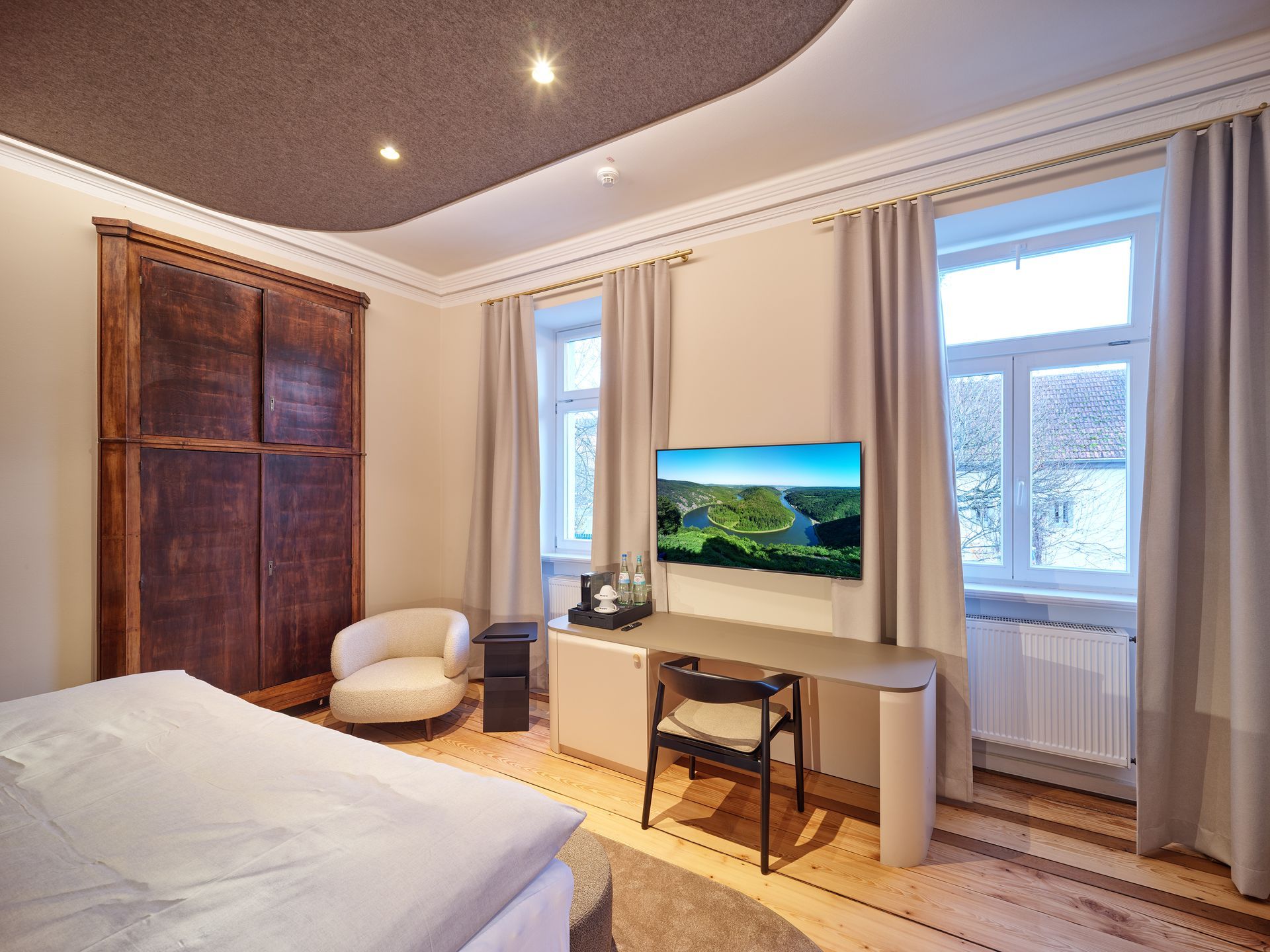 Alle Zimmer der Villa Keller by Erasmus Saarburg vereinen historischen Charme mit modernen Annehmlichkeiten: hochwertige FBF Boxspringbetten mit exklusiver Bettwäsche, elegant renovierte Badezimmer, kostenloses WLAN, Flachbild-TV, Safe und individuell gestaltete Möbel. Jedes Zimmer erzählt seine eigene Geschichte und bietet authentische Details der denkmalgeschützten Villa-Architektur in Kombination mit Premium-Komfort.