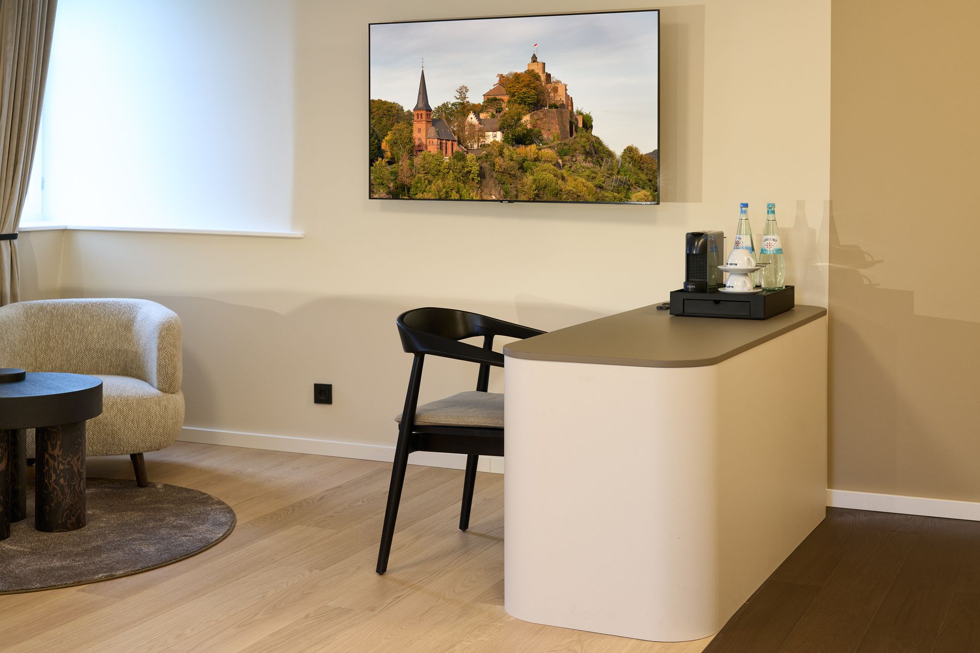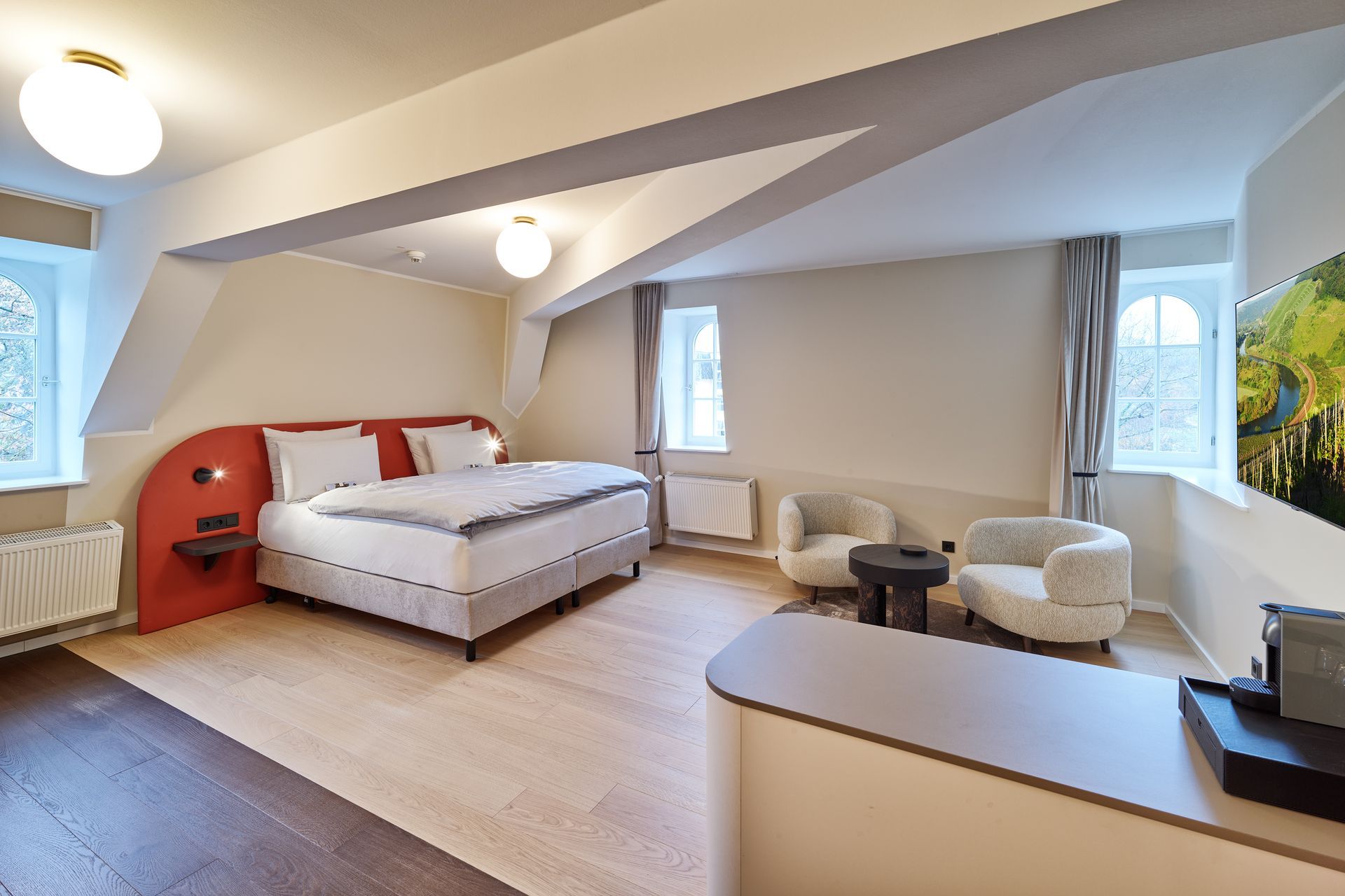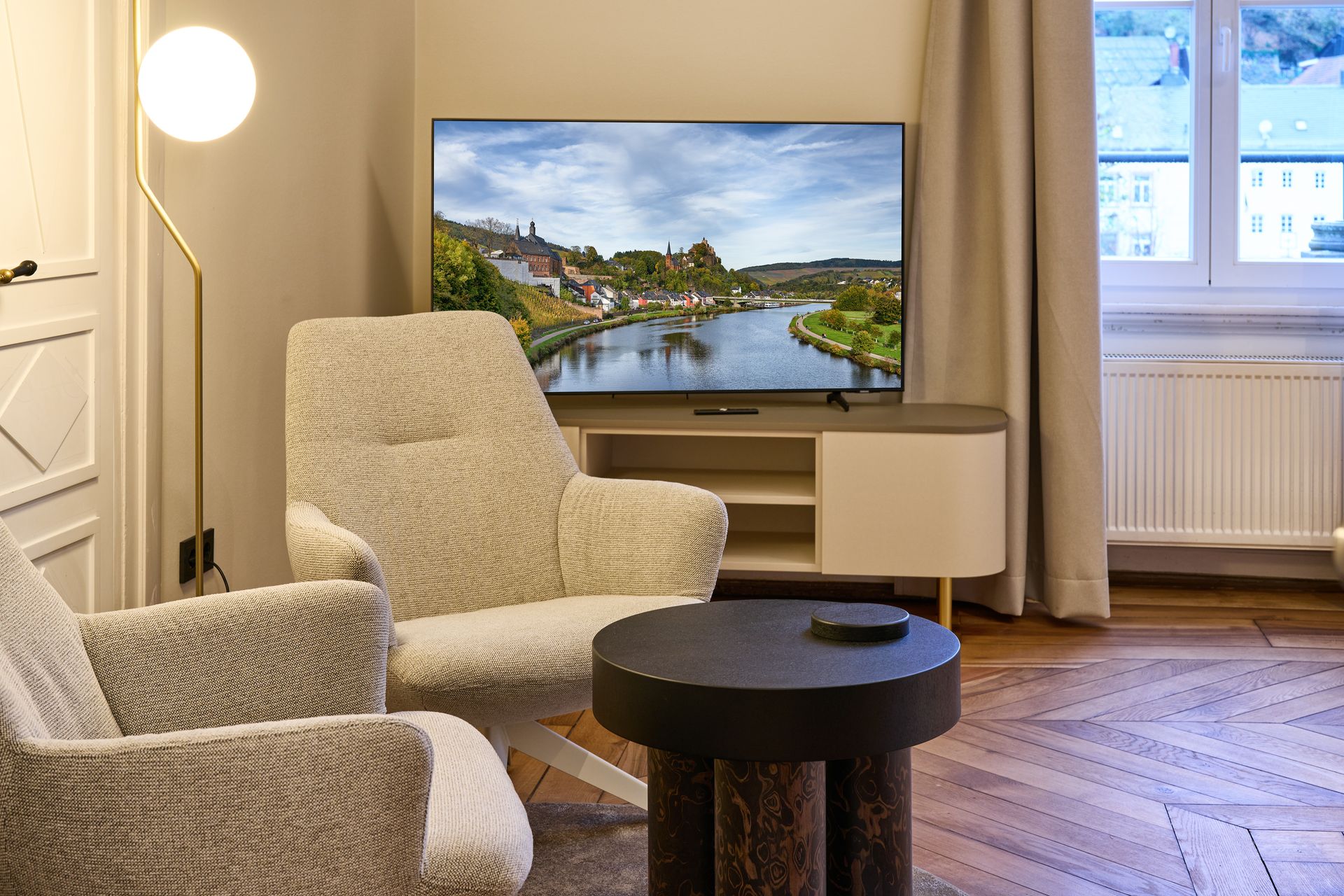 Alle Zimmer der Villa Keller by Erasmus Saarburg vereinen historischen Charme mit modernen Annehmlichkeiten: hochwertige FBF Boxspringbetten mit exklusiver Bettwäsche, elegant renovierte Badezimmer, kostenloses WLAN, Flachbild-TV, Safe und individuell gestaltete Möbel. Jedes Zimmer erzählt seine eigene Geschichte und bietet authentische Details der denkmalgeschützten Villa-Architektur in Kombination mit Premium-Komfort.
