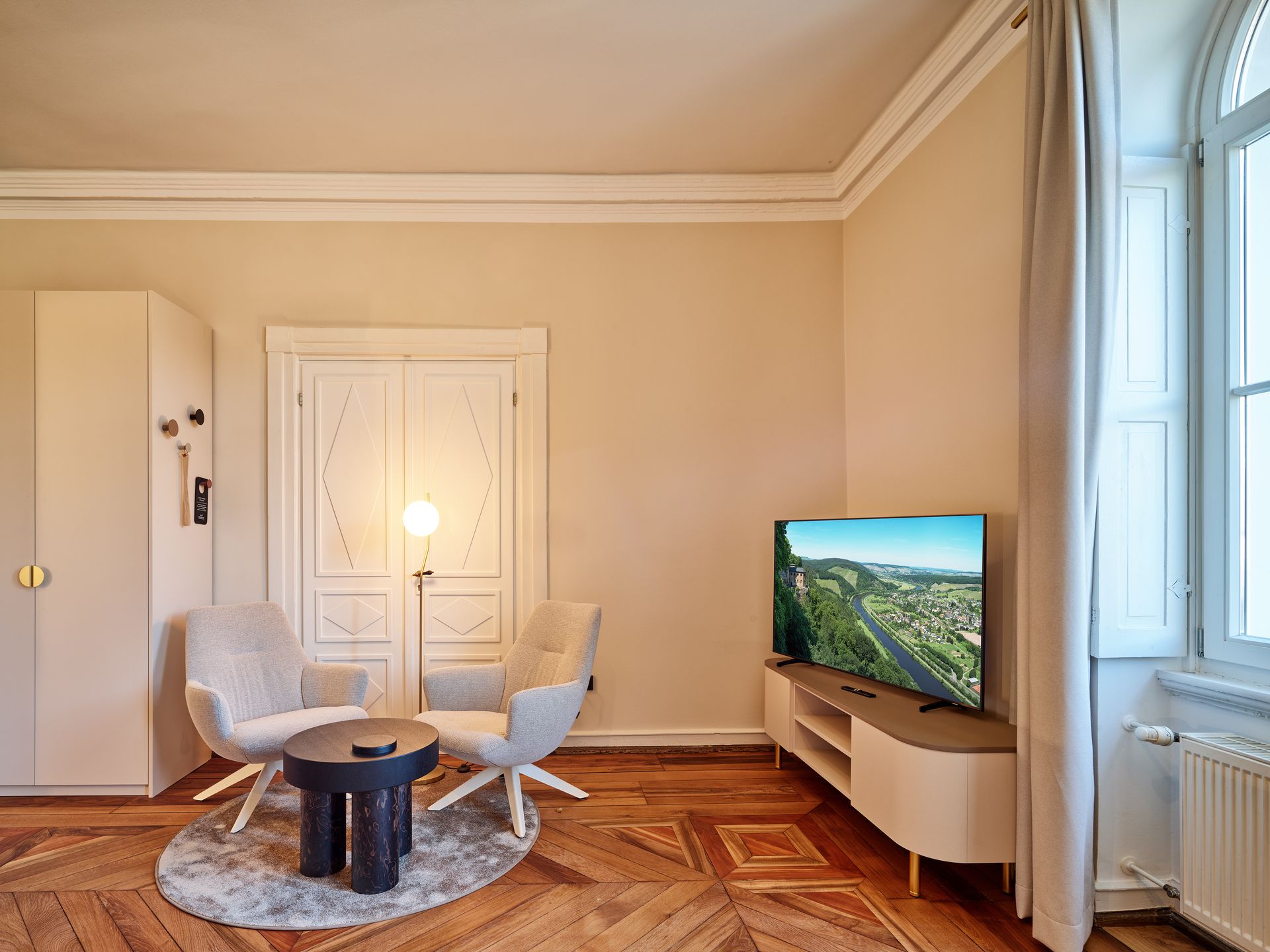 Original erhaltene Stuck-Elemente, historische Parkettböden, authentische Fenster, hochwertige Designer-Möbel und originale Architekturelemente der denkmalgeschützten Villa. Diese einzigartigen Details machen jeden Aufenthalt zu einem kulturellen Erlebnis in Saarburg.